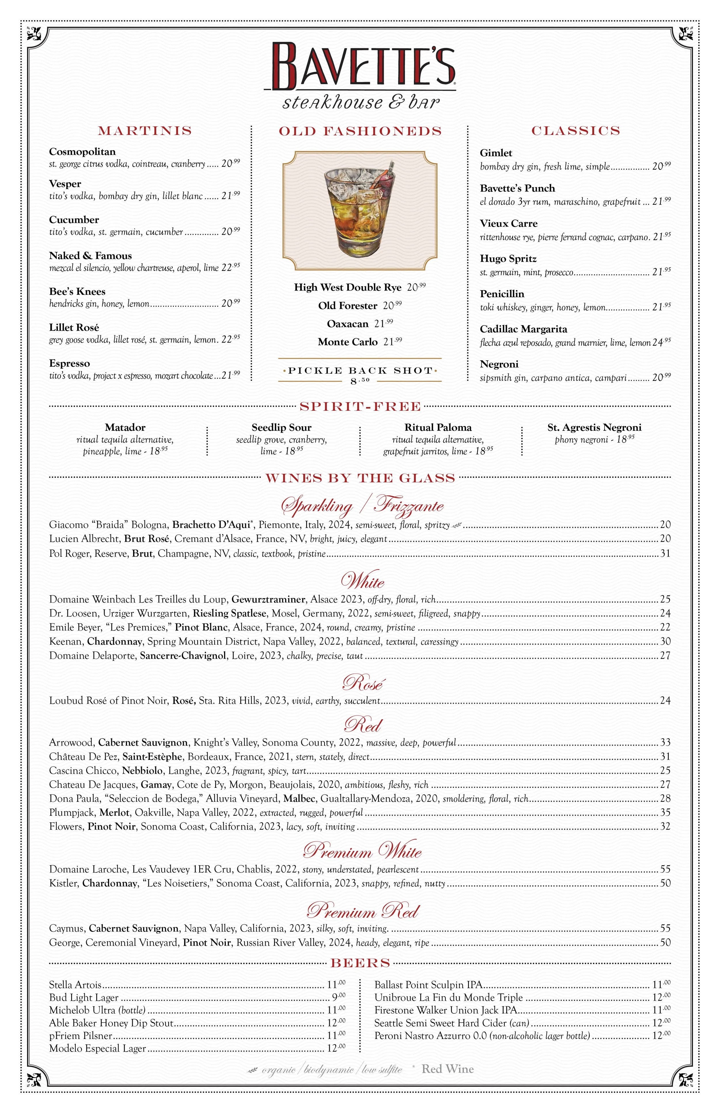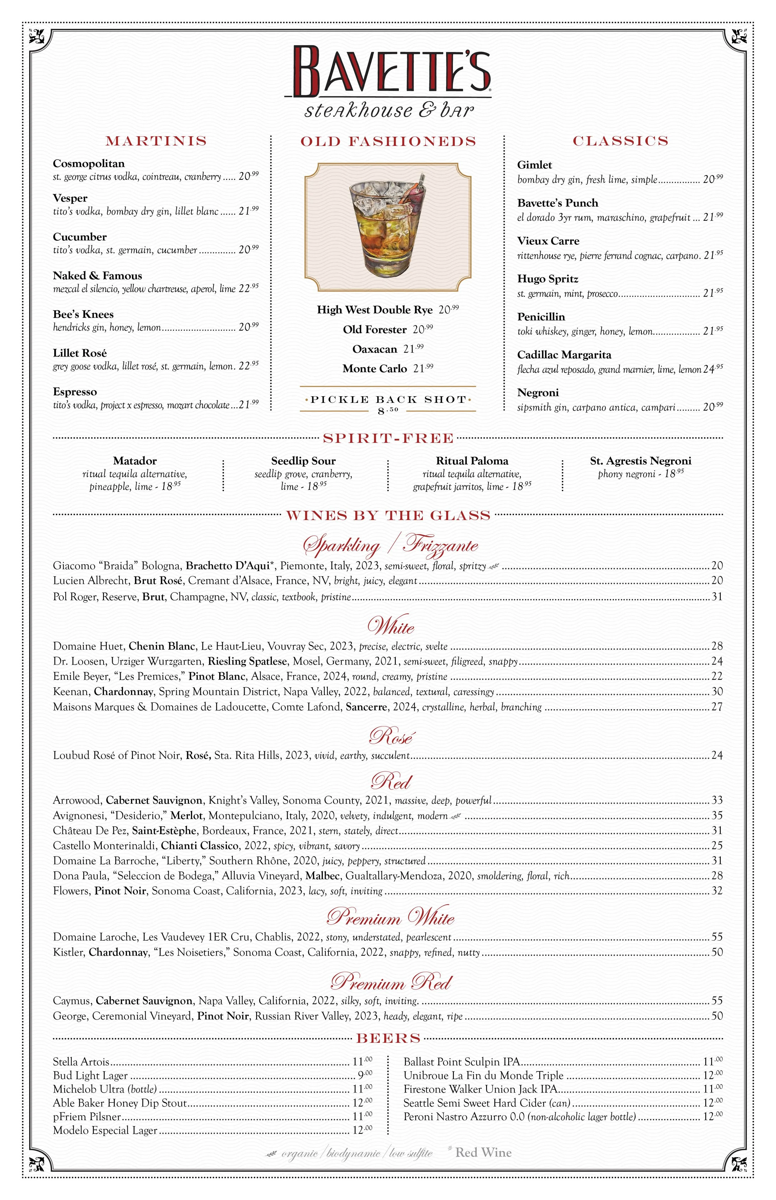 | Bavette's Dirty Martini, tito’s vodka, olive brine, blue cheese olives | 21.99 |