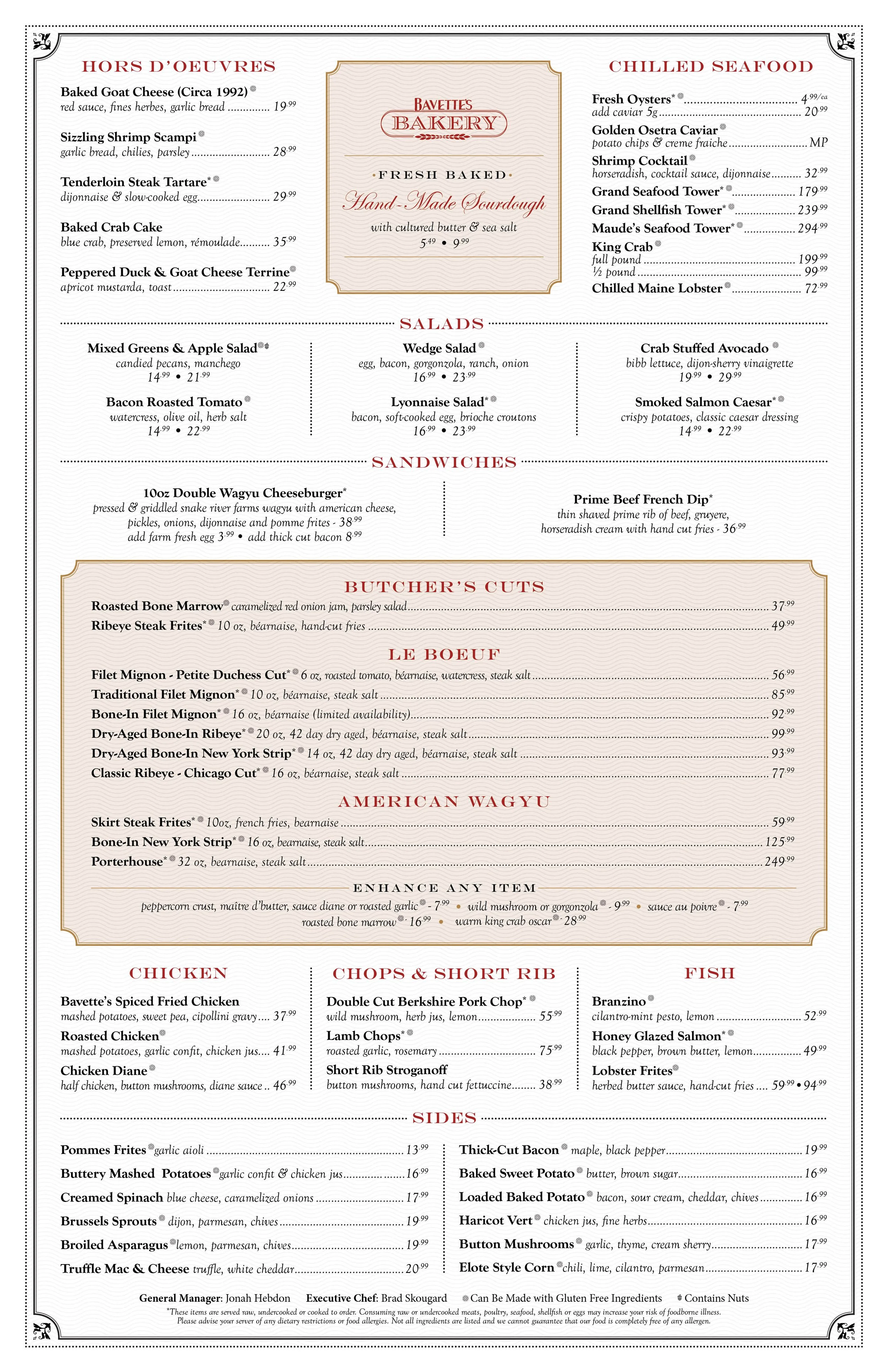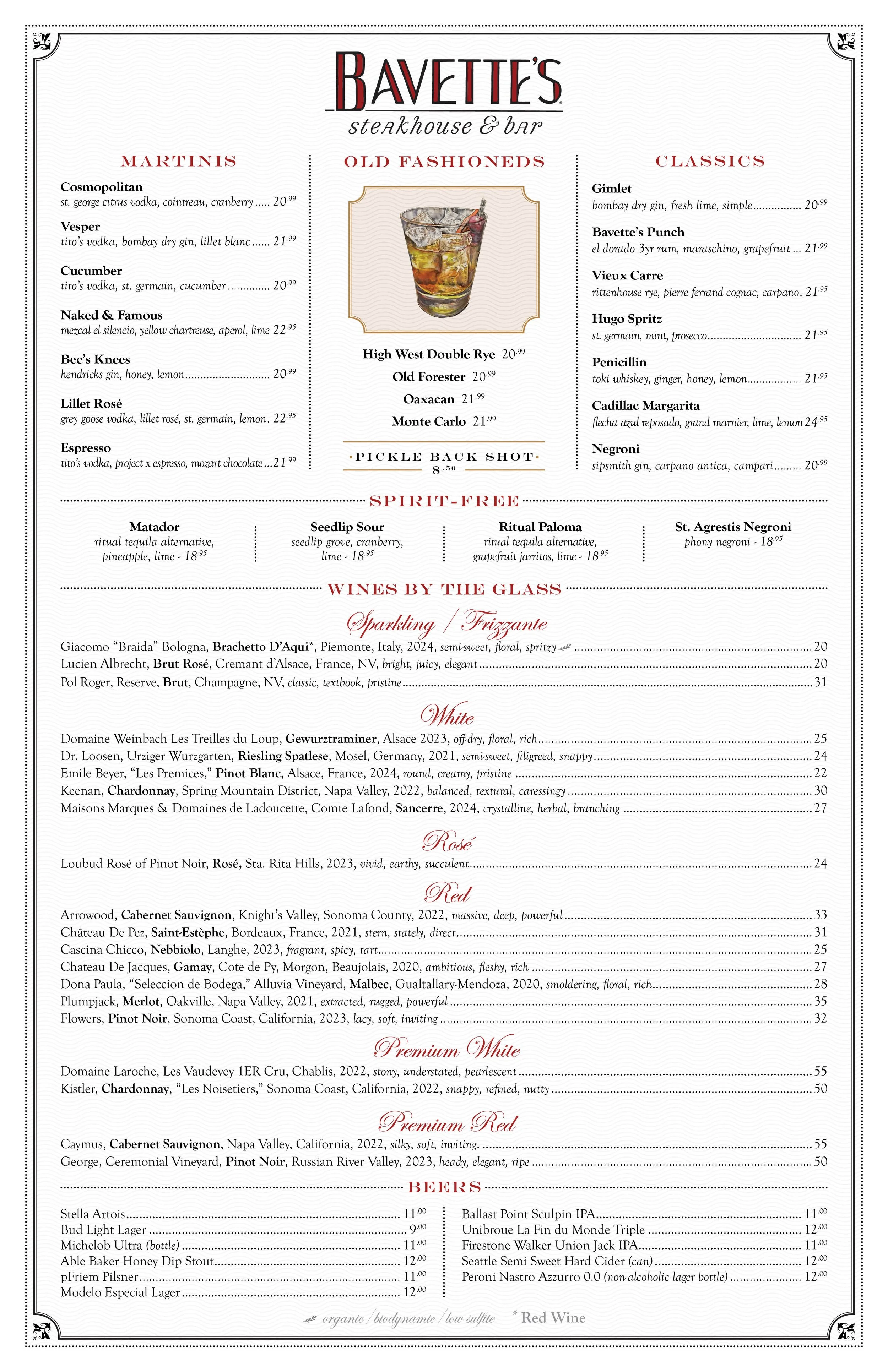 | Bavette's Punch, el dorado 3yr rum, maraschino, grapefruit | 21.99 |